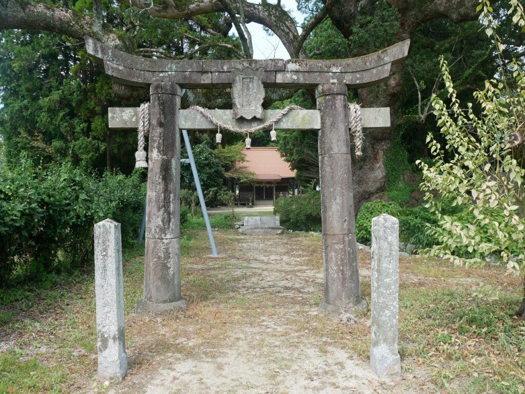 境内に立つと、クスノキの枝が空を覆い、社殿も鳥居もすっぽりと見守るように枝を広げています。