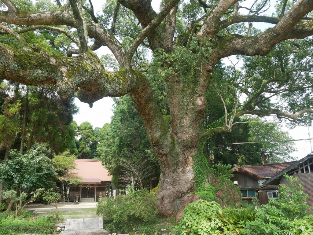 そして、この神社を語る上で欠かせないのがクスノキの巨樹です。案内板によれば、樹齢は約一千年。幹周り8.2メートル、枝張り33.2メートルという堂々たる姿で、県の天然記念物に指定されています。