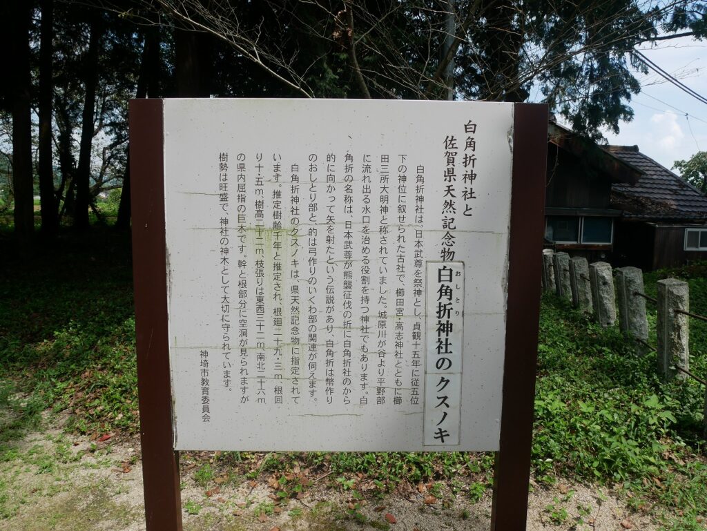 日本武尊が熊襲征伐の折にここで角折(つのおり=角のような地形の屈折部)を拠点としたという伝承が残り、社名の由来となっています。伝説と巨木とが重なり合い、白角折神社は今も地域の精神的な支柱として大切にされているのです。