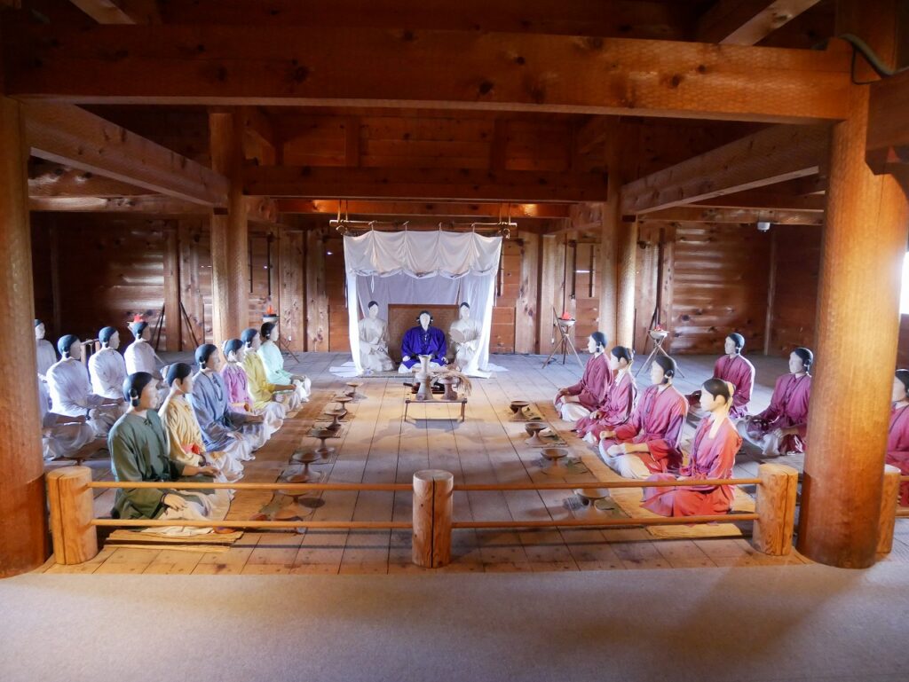 復元された会議の建物の中では、王と家臣の人形が向かい合っています。