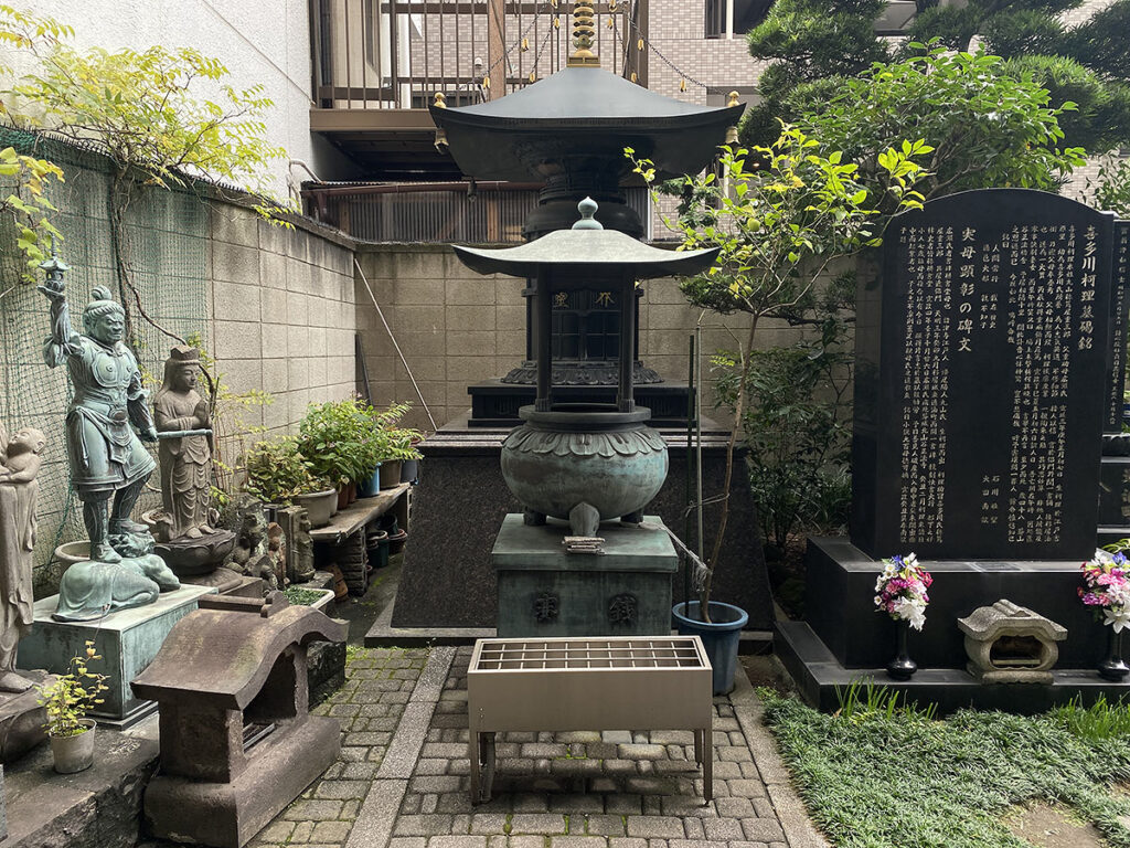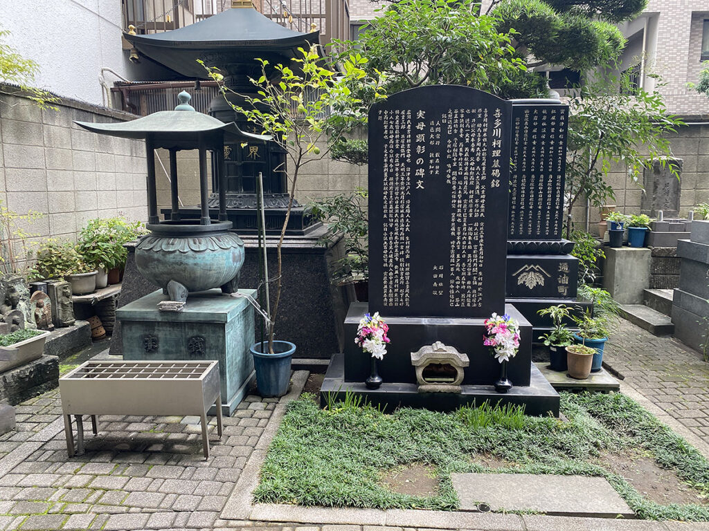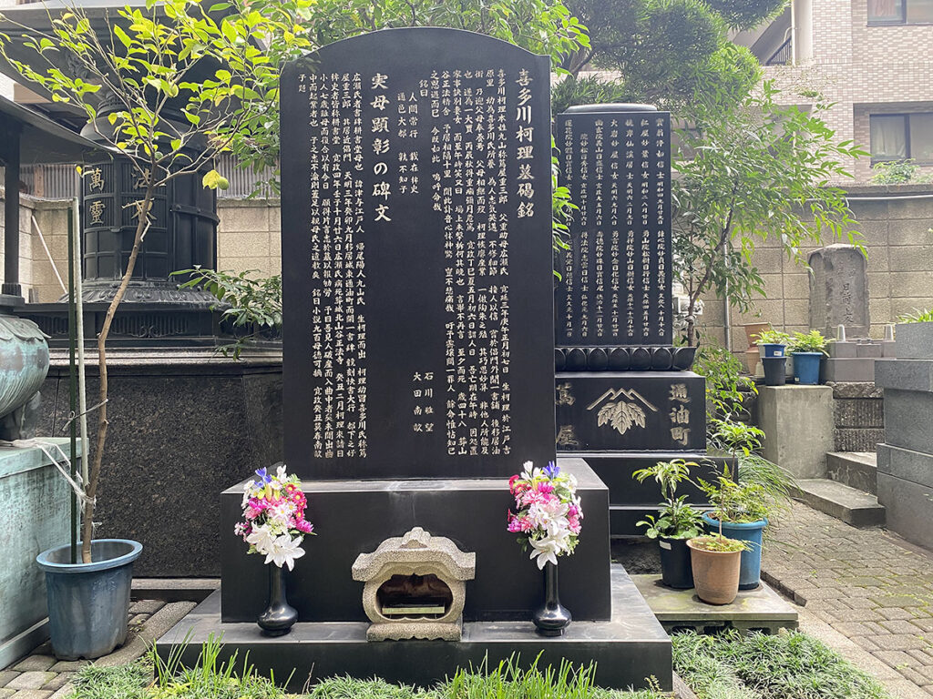 こちらが蔦屋重三郎のお墓です。江戸期に建てられた本来のお墓は、空襲や関東大震災で損壊してしまったそうで、今あるのは新しく建てられた蔦重とお母さんの顕彰碑と、蔦屋家(喜多川家)のお墓になります。