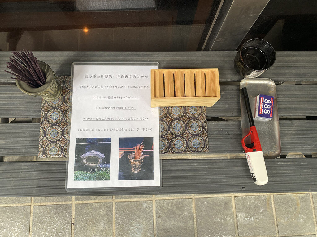 お寺の方のご厚意でちゃんとお線香が用意されていました。お賽銭を入れてありがたく使わせていただきます。