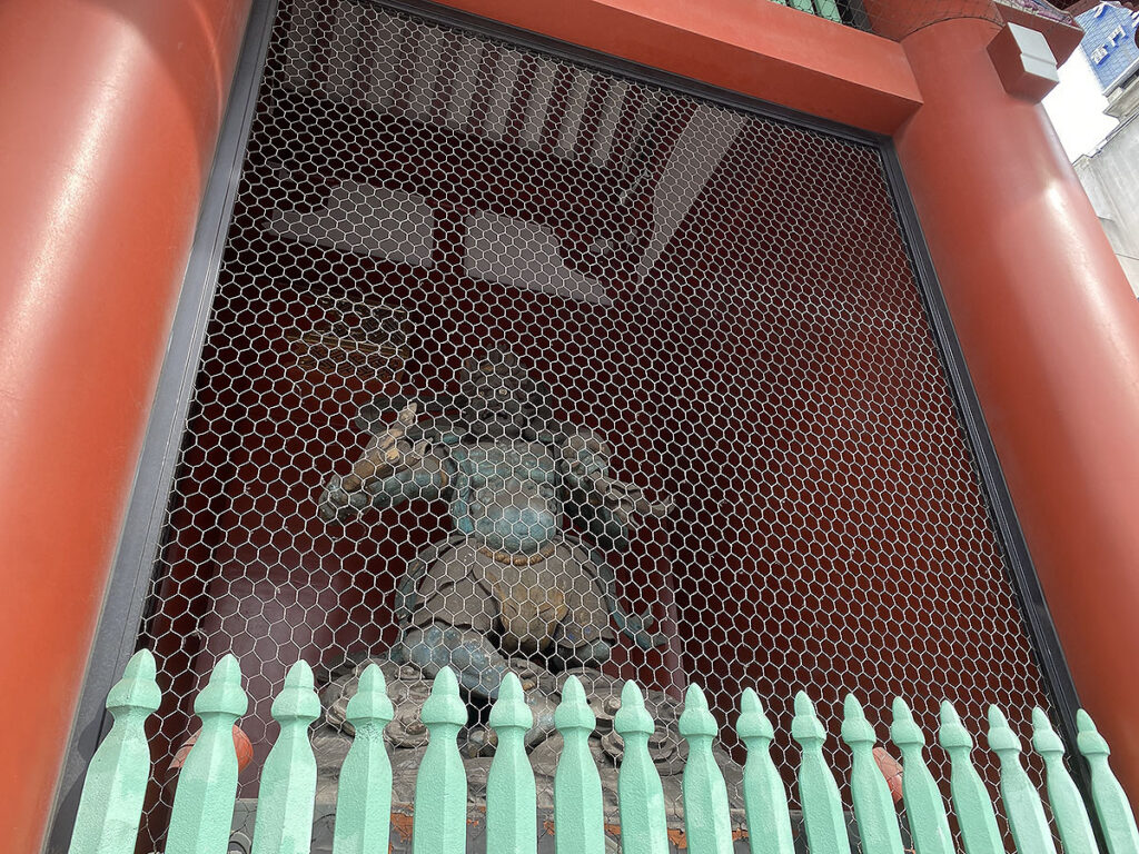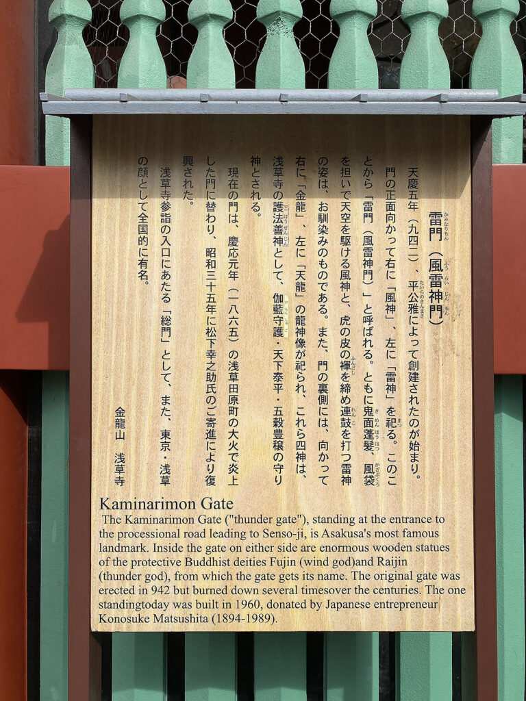浅草寺の顔ともいえる雷門ですが、右の間に風神像、左の間に雷神像を安置することから正式には「風雷神門」といいます。こちらの門はPanasonicの創始者・松下幸之助が浅草観音に祈願して病気平癒した報恩のために寄進されました。
