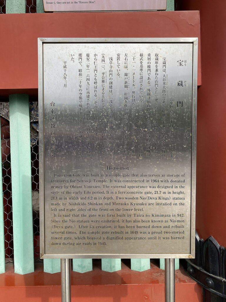 門の左右に金剛力士(仁王)像を安置してある為、かつては「仁王門」と呼ばれていましたが、昭和の再建以降は「宝蔵門」になっています。これは門の上層に、浅草寺が誇る貴重な経典や寺宝を保管する“宝蔵”を設けたことに由来しています。
