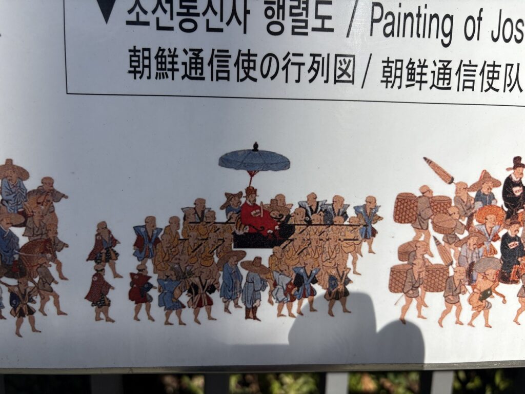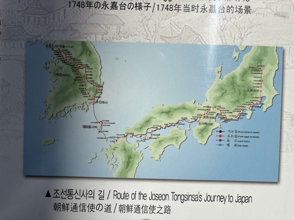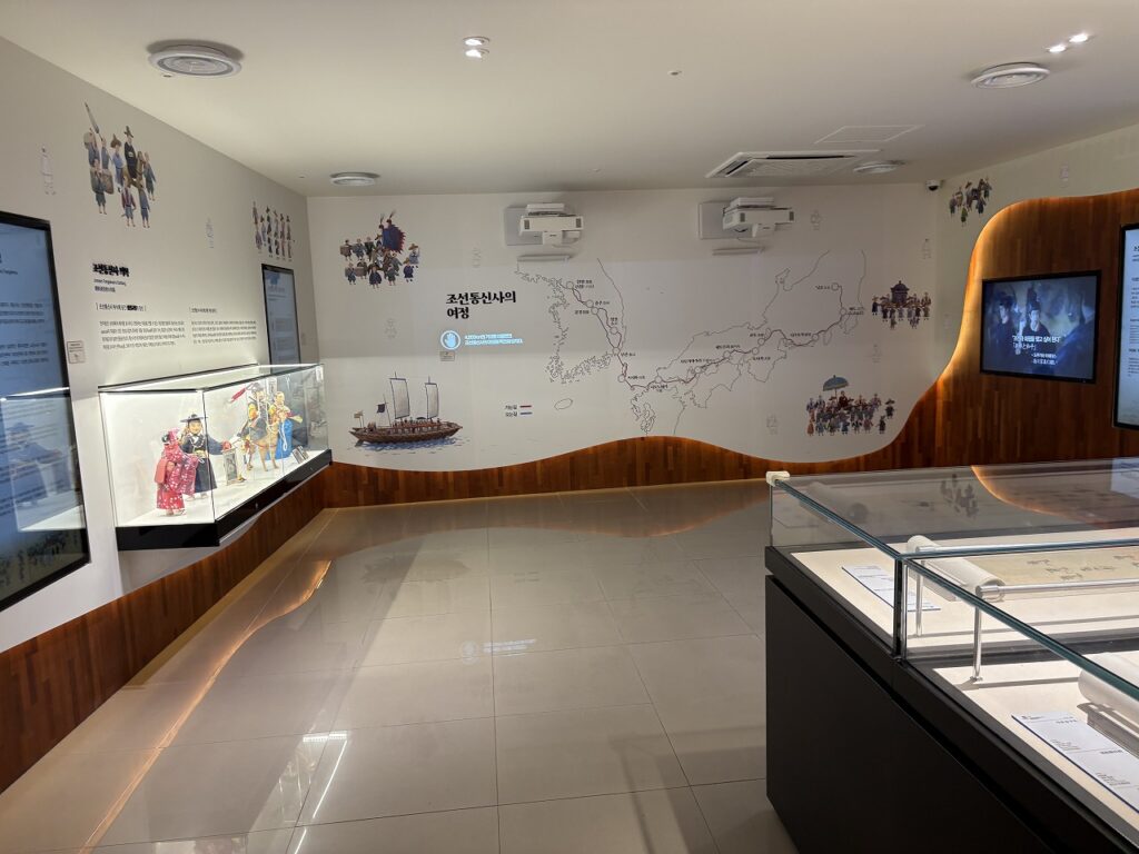 中に入ると、受付のおばちゃんがとても親切。言葉が通じなくてもニコニコと案内してくれました。展示は想像していたよりずっと好意的で、「朝鮮通信使は平和と文化を届ける使者だった」という視点でまとめられています。