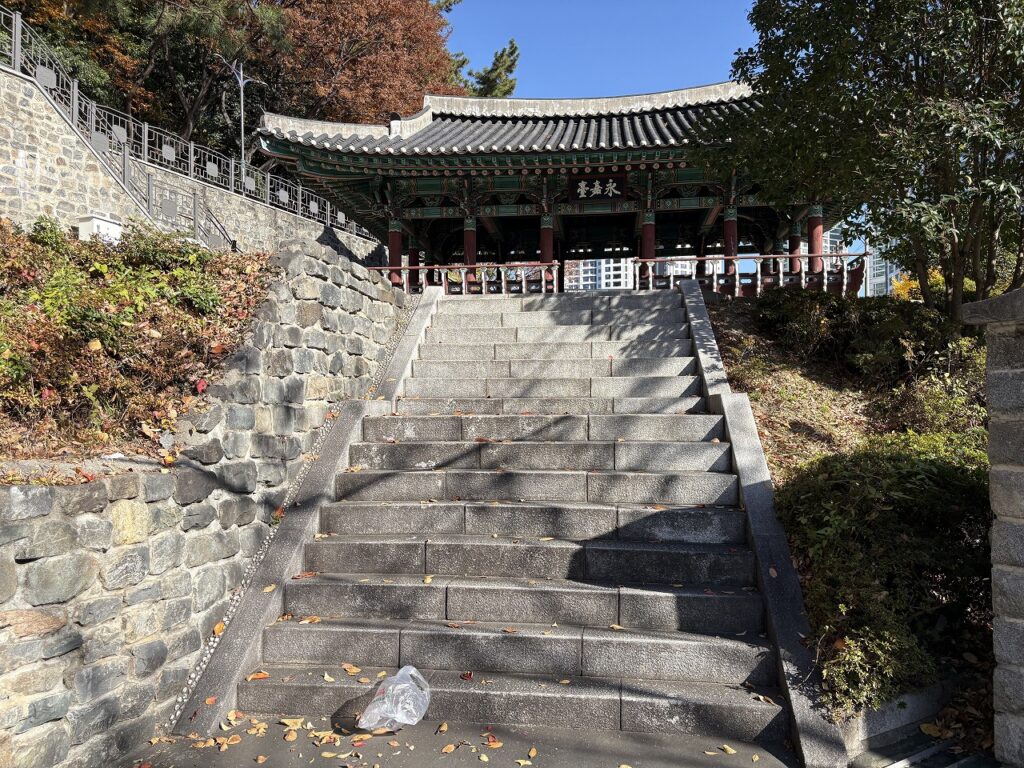 釜山鎮城の丘を下りたところにある朝鮮通信使歴史館に行ってきました。途中、楼閣・永嘉台が現れます。朝鮮通信使の一行もこの場所から日本へ向かう船を見送ったと言われます。