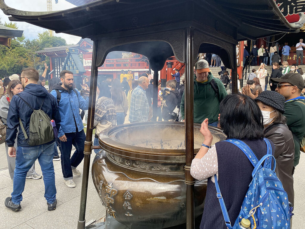 境内には常香炉(じょうこうろ)と呼ばれる大きな香炉があります。この煙を身体の悪い所にかけると治るという言い伝えがあるので、常に人が群がっています。