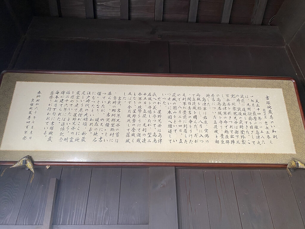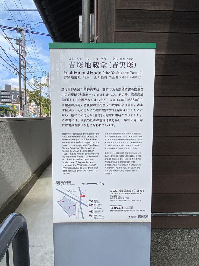 この地蔵堂がある 「吉実塚(よしざねつか)」 と呼ばれる塚こそが、この地域の地名「吉塚」の由来です。戦国時代に筑後(現在の福岡県南部)を本拠とした武将 星野吉実(ほしのよしざね) とその弟 吉兼(よしかね)がいました。