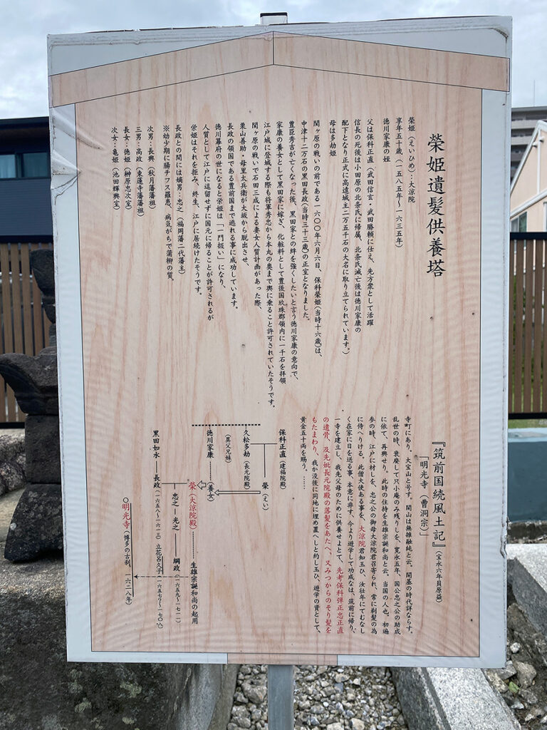 栄姫は初代・長政公の正室で家康の養女です。徳川と黒田という二つの有力家を結ぶ政略結婚の当事者であり、福岡藩成立の背景に欠かせない存在のお姫様ですね。