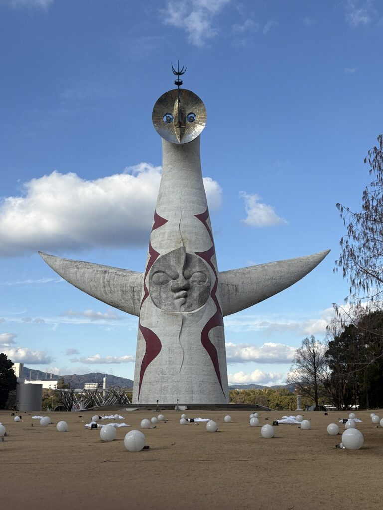 帰りに、近くの太陽の塔も見てきました。改めて見ると、意味はよく分かりません。でも、この流れで見ると、不思議と「民族的」に見えてきます。
