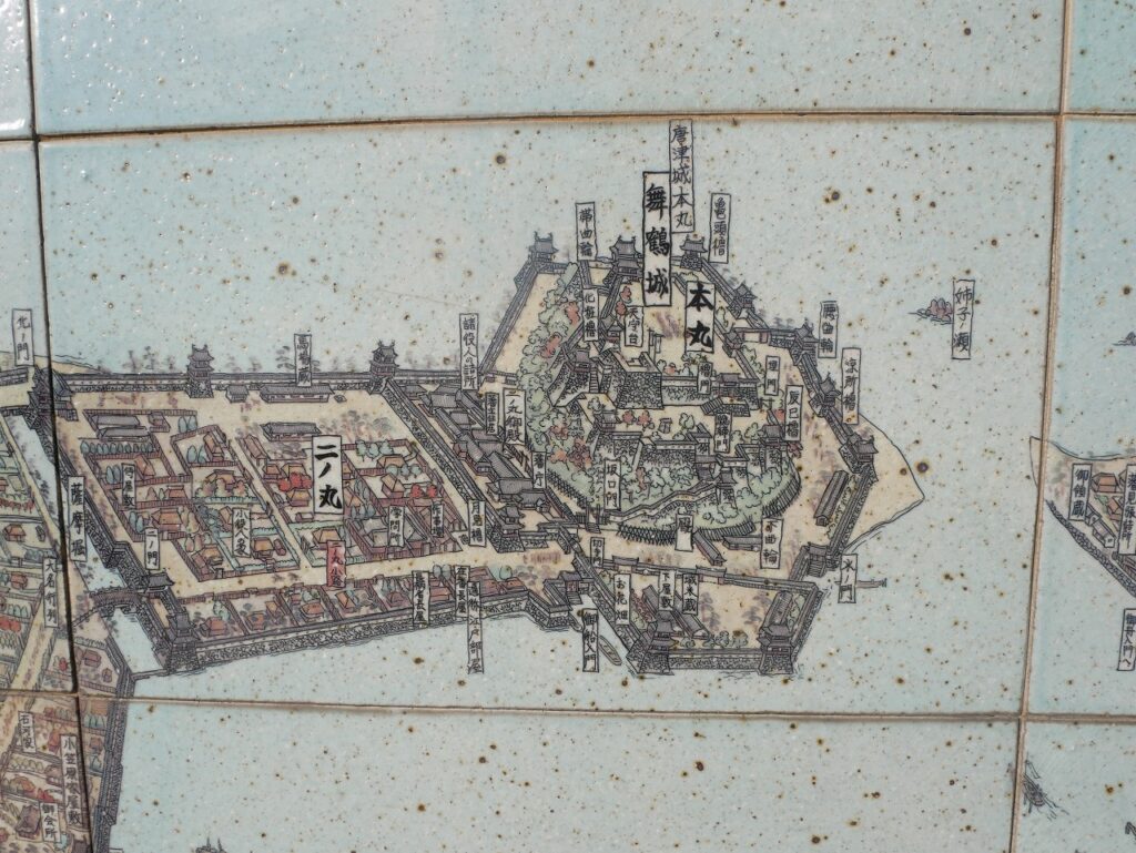 往時の唐津城を描いた絵図も展示されていた。本丸、二の丸、三の丸——今歩いている範囲より、はるかに広い城域が描かれている。城外へ —— それでも、かつては城内