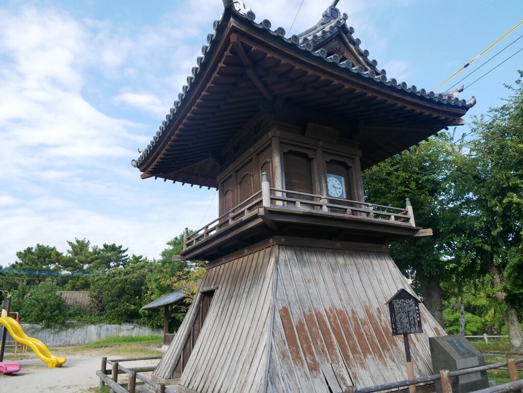 城外に出ると、「時の太鼓」の説明板と櫓風の建物があった。いまは城の外に見えるが、当時はここも城内だったのだろう。