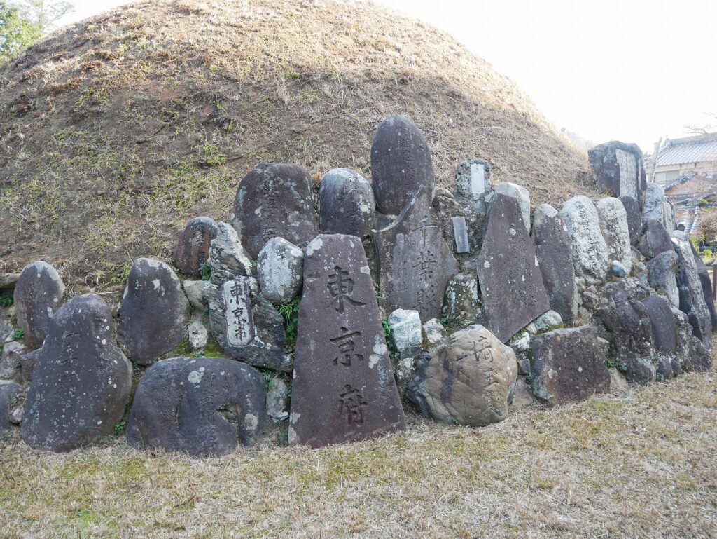 寺のはしっこまで歩いてくると、視界の先に奇妙な形の塔が見えてきた。丸く盛り上がった土の塚の上に、石の塔がすっと立っている。遠目には、どこかモスクの塔のようにも見える。近づいてみると、これは万骨塔と呼ばれる供養塔だった。塚の周囲には無数の石碑が積み上げられている。